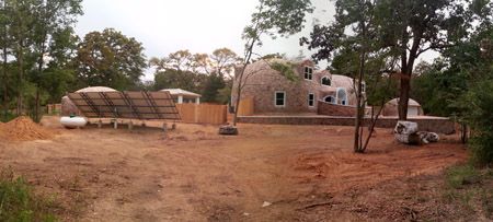 One of the things I never anticipated when we first discussed this project, would be the need for a retaining wall since the ground has a substantial slope to it. Looking at the land you really don't notice it, but it has about an 8% grade across the whole thing. So when we put the house in at ground level in the back, it was almost 4 feet above grade level in the front. No big deal to build up the pad and level the house, but the landscaping needs a retaining wall to keep the root system of the big tree from being buried and causing problems. This is our retaining wall. You can also see it in the panorama above. (BTW, the blue tint to the cap is the primer, but the final color)